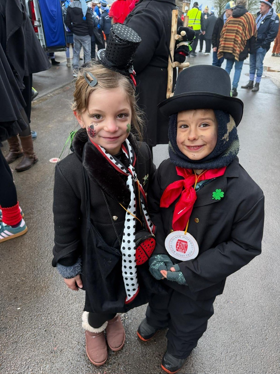 Alle hatten sich als glücksbringende Schornsteinfeger mit allerlei Accessoires verkleidet. "Kamellen" und anderes Wurfmaterial wurden entlang des Zugweges reichlich geworfen und aufgrund des Wetters auch oft direkt in die Tüten der Sammelnden verteilt. Zum Schluss war der Bagagewagen der Fa. Frings, der zu Beginn bis zum Dach vollgepackt war, dann auch fast leer.